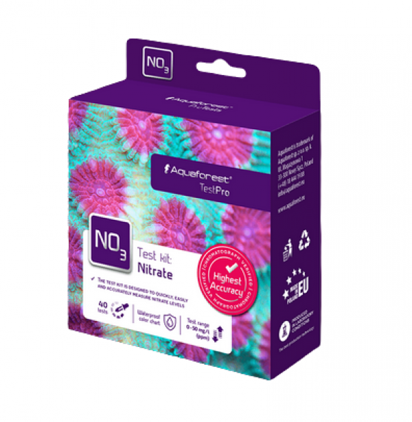 AF Nitrate TestPro برای اندازه گیری سریع یون های نیترات در آکواریوم های دریایی طراحی شده است. نیترات در آب نتیجه نهایی فیلتراسیون بیولوژیکی است. غلظت بالای نیترات باعث رشد جلبک های نامطلوب می شود. سطح نیترات در آکواریوم های صخره ای باید 2-5 میلی گرم در لیتر (ppm) باشد. این کیت تست حاوی معرف های کافی برای انجام 40 آزمایش غلظت نیترات است. محتویات کیت: 1- ظرف معرف A-NO3 2- بطری معرف B-NO3 3- 1 ویال تست با درپوش 4- سرنگ 1 میلی لیتر 5- سرنگ 2 میلی لیتر 6- قاشق اندازه گیری 7- کتابچه راهنمای دستور العمل