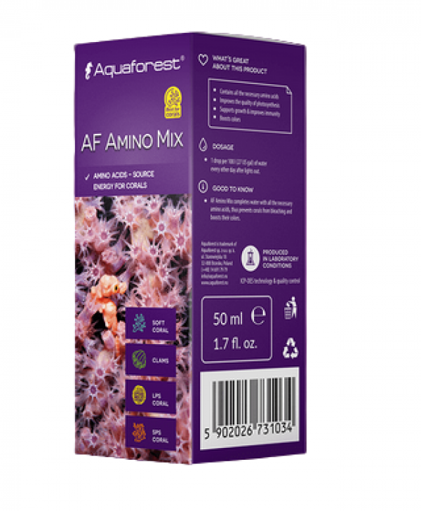 محلولی ضروری برای آکواریوم های آب شور به ویژه برای اکواریوم های با سیستم های با مواد مغذی کم (ULNS) . حاوی آمینو اسیدهای غلیظ شده که یکی از منابع اصلی انرژی برای همه مرجانها و فیلتر فیدرها می باشد. آمینو میکس سوخت و ساز را افزایش داده و به خوبی محلول ویتالیتی آکوافارست به رشد مرجانها کمک می کند. در مرجانهای طبیعی غلظت آمینو اسید کلی پایین می باشد. این میزان حدود 200-500 nmol/l می باشد. مطالعات اخیر دانشمندان اثبات کرده است که مرجانها بسته به توانایی شان می توانند تا 7 برابر این مقدار آمینو اسید را جذب کنند. آمینو اسید به راحتی توسط اسکیمر، ذغال اکتیو و یا ازن حذف می شود . توصیه می شود که به طور منظم استفاده شود. بهتر است که همزمان با محلول ویتالیتی آکوافارست استفاده شود.